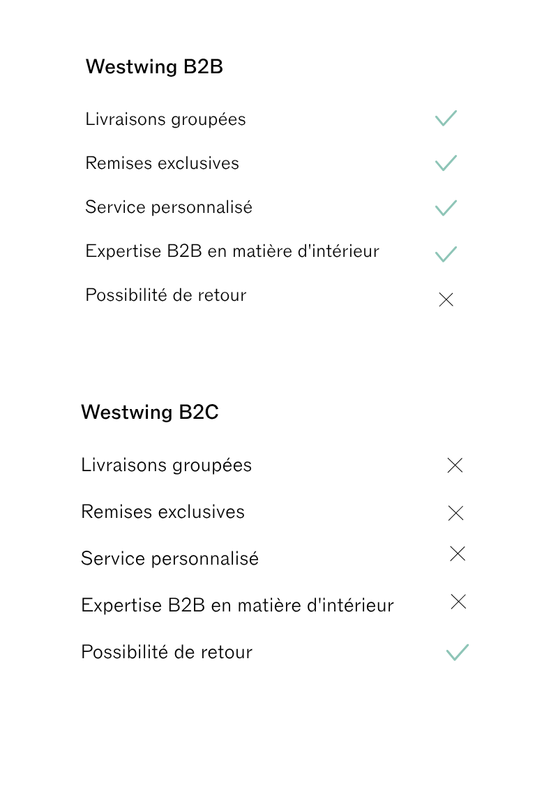 Westwing est le leader du e-commerce inspirationnel dans le secteur Home & Living. Notre mission : rendre chaque intérieur plus beau. Avec Westwing Business, nous souhaitons transmettre cette philosophie à nos clients professionnels et transformer les espaces commerciaux en lieux inspirants, où l’on se sent bien, où l’on aime passer du temps, et où l’on travaille dans un cadre aménagé avec du mobilier B2B adapté. En tant que client professionnel, vous bénéficiez d’un accompagnement personnalisé à chaque étape de votre projet d’aménagement, assuré par notre équipe de spécialistes Westwing Business. À partir de concepts sur-mesure, nous répondons précisément aux besoins de votre projet et concrétisons vos envies grâce à notre service d’architecture d’intérieur. Que vous recherchiez des solutions compactes et fonctionnelles ou des espaces spacieux, lumineux et confortables, nous développons à vos côtés un concept d’aménagement parfaitement aligné avec vos attentes et votre identité. Chez Westwing Business, nous avons le mobilier professionnel, la décoration et l’éclairage adaptés à chaque entreprise. Grâce à notre large gamme de produits, nous aménageons tous types d’espaces commerciaux et trouvons la solution idéale pour vous : qu’il s’agisse de bureaux, d’espaces de travail, de restaurants, cafés ou bars, de projets dans l’hôtellerie ou même de la rénovation d’un cabinet médical. Nous créons également des concepts innovants pour le commerce de détail et réalisons des projets extérieurs. Notre priorité : vous offrir un service complet, basé sur la qualité, l’esthétique, la durabilité et l’innovation.