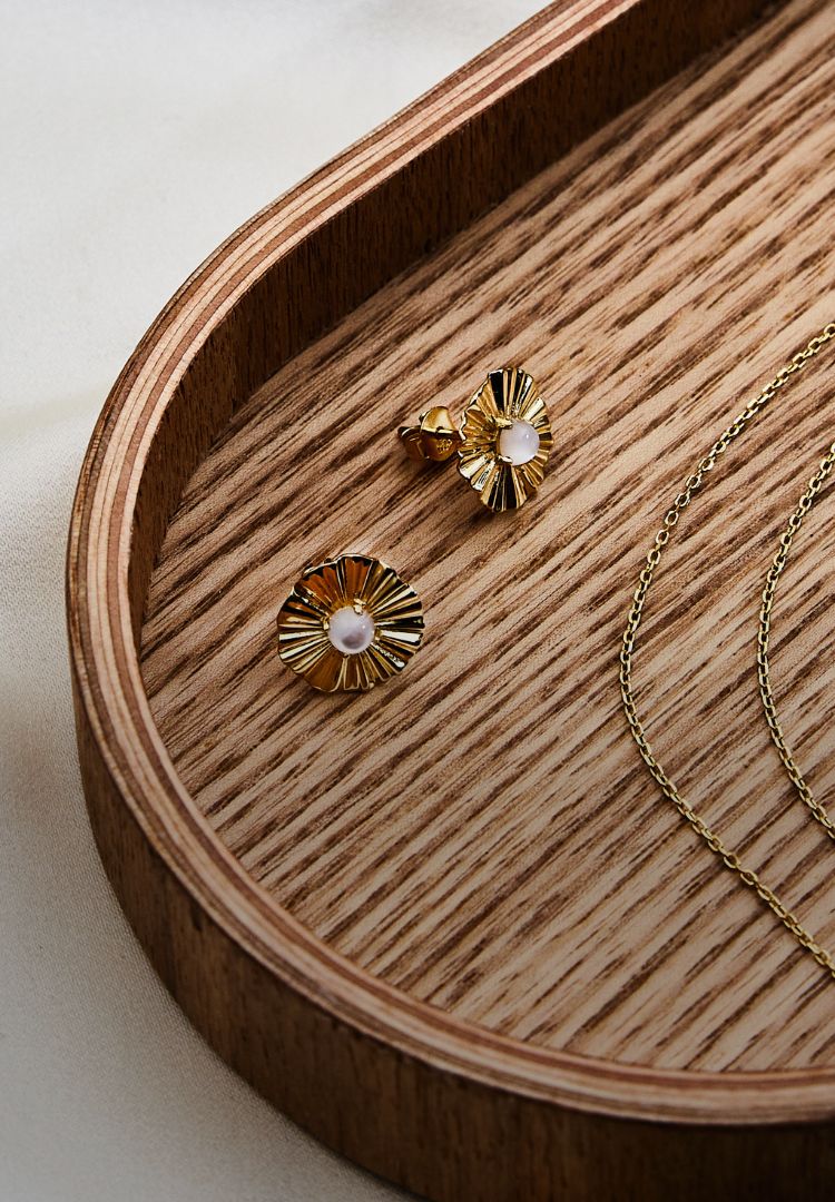 The gold-plated FLORA necklace features an 18-carat gold finish and hand-set zirconia stones – offering a subtle sparkle reminiscent of real diamonds. Inspired by the water nymphs of Greek mythology, the design embodies flowing shapes and quiet strength.