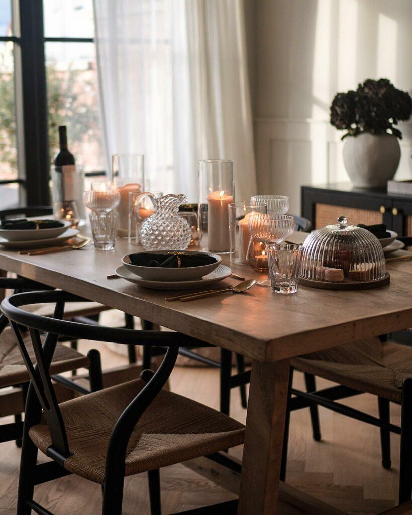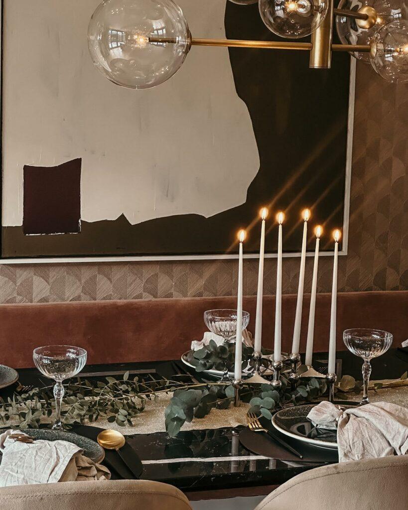 Vous êtes adepte du style art déco ? Optez pour cette esthétique élégante en l’adoucissant de quelques détails bohème. D’abord, préférez de la vaisselle foncée, des couverts assortis aux finitions dorées et des verres en cristal ciselé. N’oubliez pas les emblématiques coupes de champagne des années folles. Puis, un fin chandelier en métal et aux formes géométriques donnera la dernière touche rétro chic.