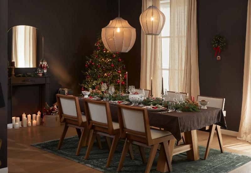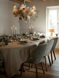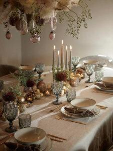Enfin, n’oubliez pas d’utiliser des plantes de saison pour parfaire cette esthétique champêtre. Si un luminaire est suspendu au-dessus de votre table, ornez-le d’espèces hivernales et de quelques boules de Noël au style ancien. Un centre de table composé de branches d’eucalyptus séchées ou de petites pommes de pin crée un relief discret mais très élégant.