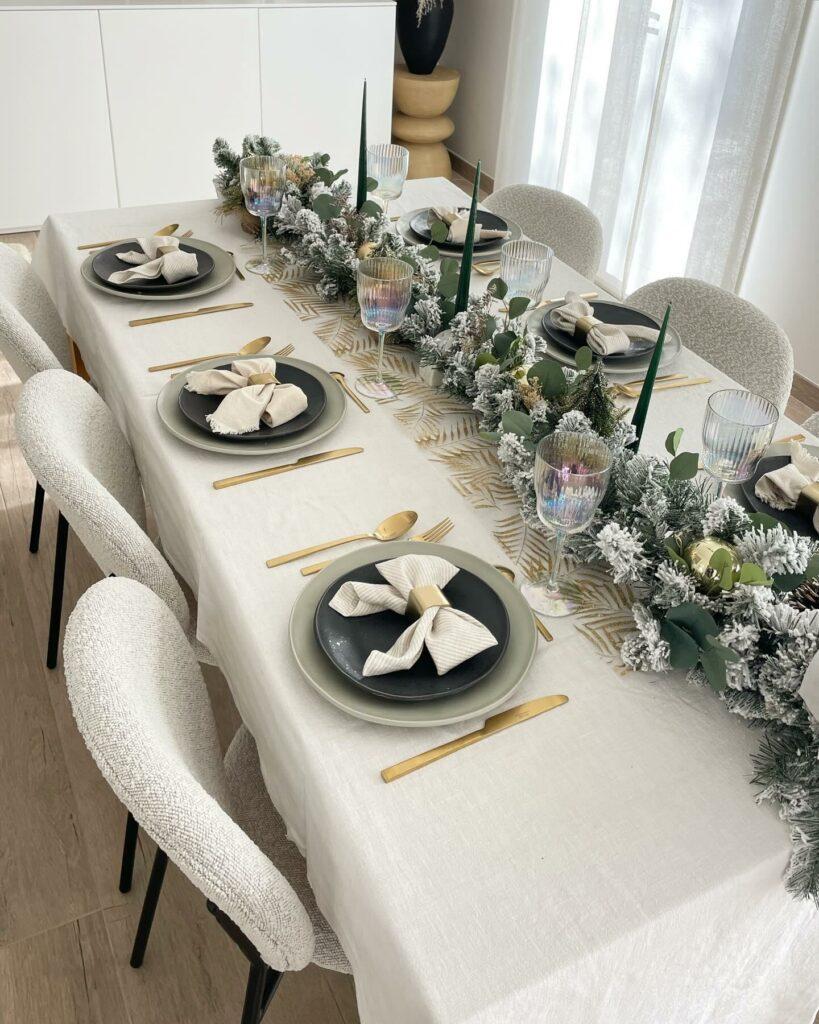 Comme évoqué, un beau chemin table suffit à enrichir la décoration d’une table de Noël simple. Juxtaposez au milieu de votre table de petites branches de sapin touffues (artificielles ou véritables) de manière à suivre toute la longueur de votre table, en débordant légèrement. Ajoutez quelques feuilles d’eucalyptus et des bougies coniques vertes, et votre décoration est transformée.