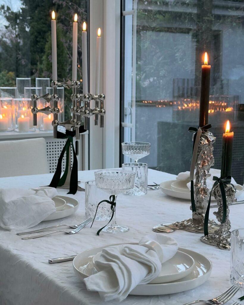 Les plus belles tables de Noël peuvent aussi être très modernes, la preuve avec cette décoration design. Pour réussir cette décoration, peu de couleurs sont nécessaire : du blanc pur pour le linge et la vaisselle, des objets design chromés qui attirent le regard et quelques détails noirs (bougies et rubans). Toutefois, le choix des pièces de design est crucial. Pour être sûrs de votre style, optez pour les bougeoirs chromés géométriques de Stoff Nagel et ceux de Pols Potten à effet fondu. De plus, une lumière chaude ou neutre mettra en valeur les reflets chromés, tandis que des bougies noires créent un contraste sophistiqué.