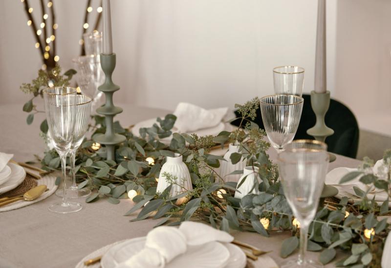 Enfin, tout la force ce style naturel reposera sur votre chemin de table végétal. Posez simplement de belles branches d’eucalyptus à petites feuilles et une guirlandes lumineuses discrète. Accompagnez-la de petits vases blancs et de deux bougeoirs vert sauge, et votre chemin de table est prêt.