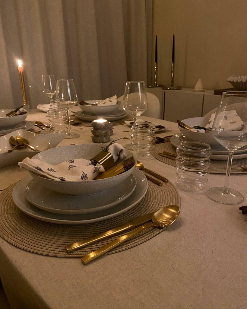 Notez que la vaisselle et les verres à liseré doré apportent une touche d’élégance supplémentaire.