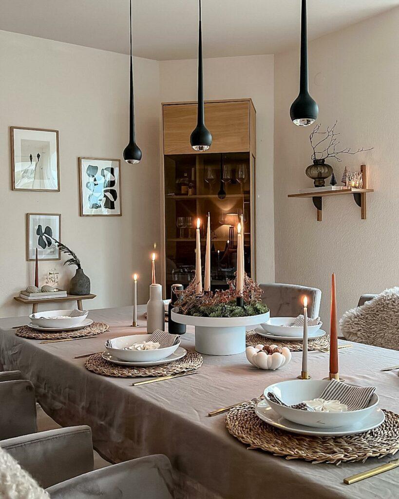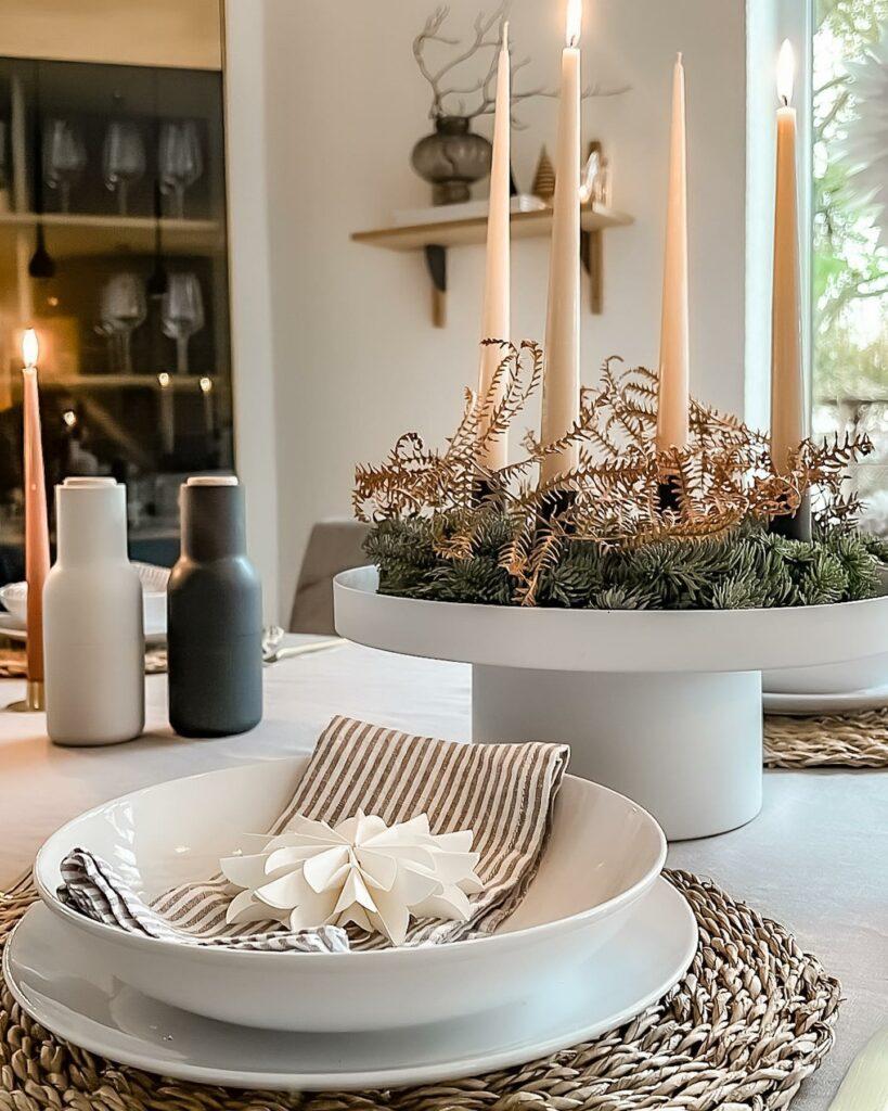 Alliant minimalisme et chaleur, le style scandinave transmettra à vos convives une ambiance simple et moderne. Pour obtenir cette esthétique, dressez votre table avec une nappe beige clair et de la vaisselle épurée blanche. Des couverts dorés assureront l’aspect élégant et festif. Amenez ensuite un peu de nature en disposant des sets de table en fibre naturelle (rotin, osier ou jacinthe d’eau) et une grande coupe décorative ornée de branches de sapin, de fougères sèches et de bougies.