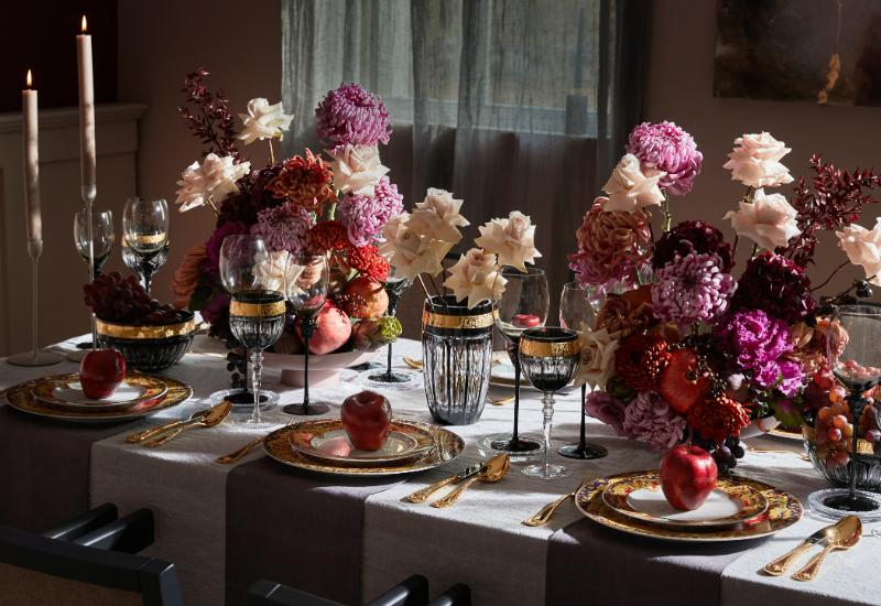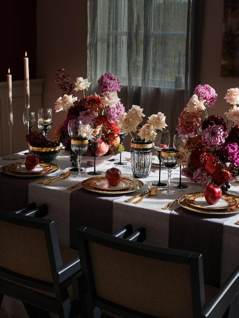 Vous faites partie de ceux qui aiment l’abondance des fêtes de Noël ? Voici une décoration extravagante et maximaliste pour votre table. Pour la réaliser, multipliez les éléments dorés, des verres aux couverts en passant par toutes les assiettes et bols. Surtout, déposez deux vases ornés de généreux bouquets fleurs rouges, pourpres et rose. Ils déploieront une élégance exubérante qui inviteront à la fête.