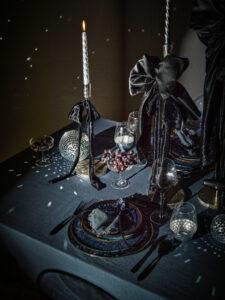 Si votre table accueillera un dîner de Noël entre amis, vous pouvez oser un style de soirée chic plutôt que de repas familial. Profitez-en pour changer les codes en adoptant une décoration en bleu et noir, avec quelques touches dorées et argentées. Privilégiez des nuances de bleu intense (bleu pétrole, bleu nuit) pour votre nappe et vos assiettes, en posant des détails noirs tels que des rubans de satin sur vos chandeliers argentés. Un petit accessoire déco évoquant, par exemple, une boule à facette pourra parfaire le look.