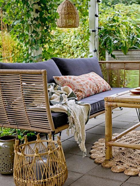 pièce claire, couleur beige, parquet clair, tapis coloré, canapé et plantes séchées