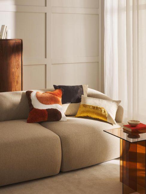 salon tendance déco 2025 dans le style bord de mer avec tapis en jute et coussin à cordages bleus