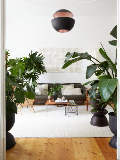salon style japandi, canapé arrondi blanc, suspensions en papier