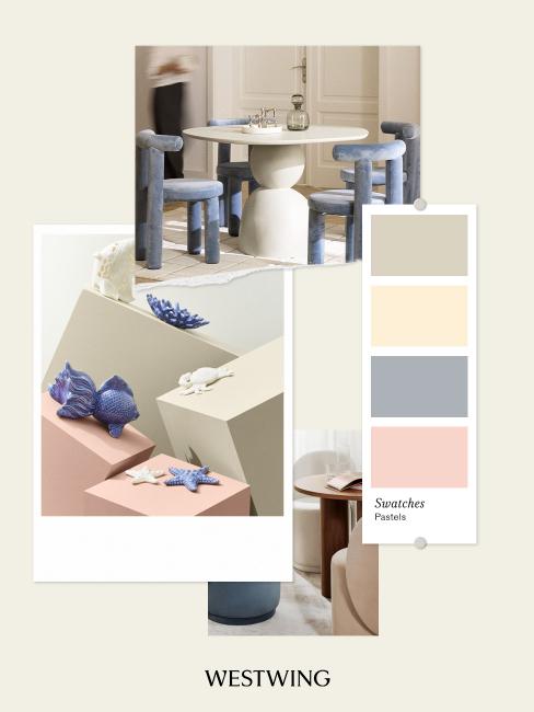 salle à manger moderne, mur bleu, chaise en velours bleu