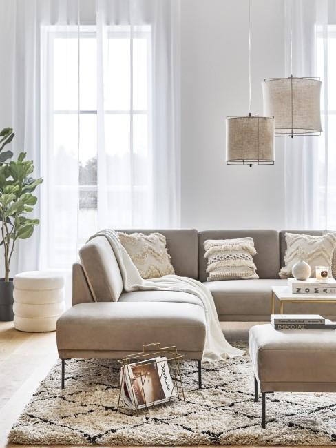 Salon rustique avec canapé crème, tapis beige et plaid blanc