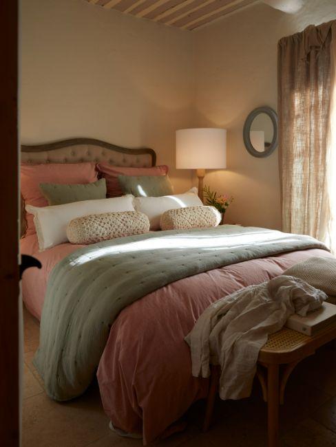 chambre parentale, style printanier, lit jaune pastel et mauve