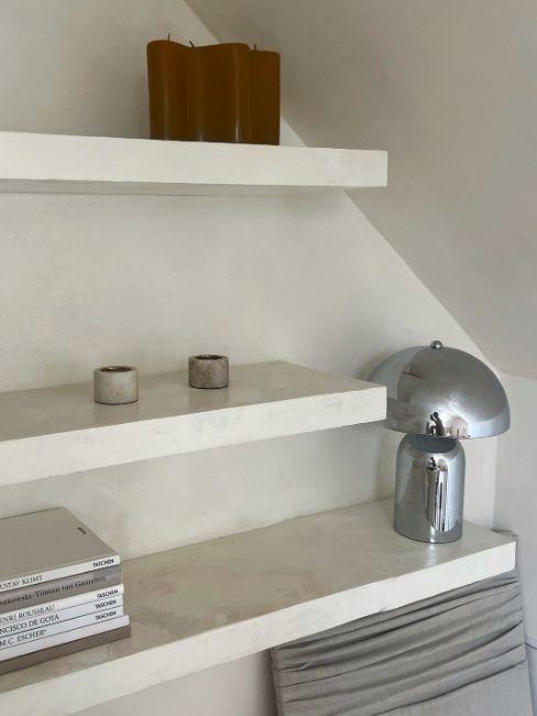 tendance déco 2024, lambris en bois foncé, lampe champignon chromée, commode cannelée en bois foncé