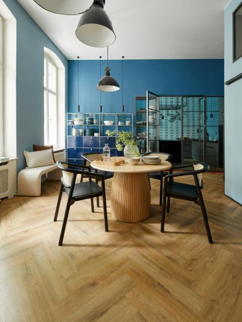 chambre avec mur bleu, miroir doré, et commode noire avec du cannage chez Julien Duquaire