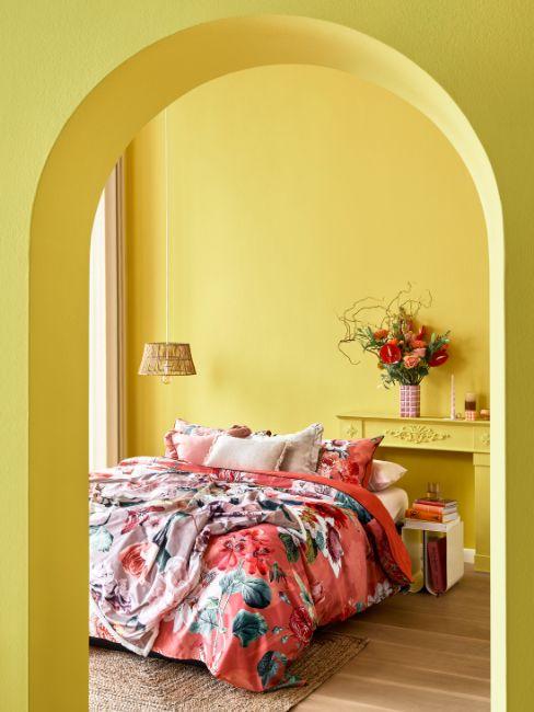 chambre estivale, murs blancs, lit couleur rosé et rose pêche