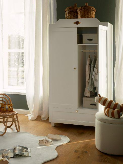 chambre à coucher vert pastel, plaid, panier, bouquet de fleurs