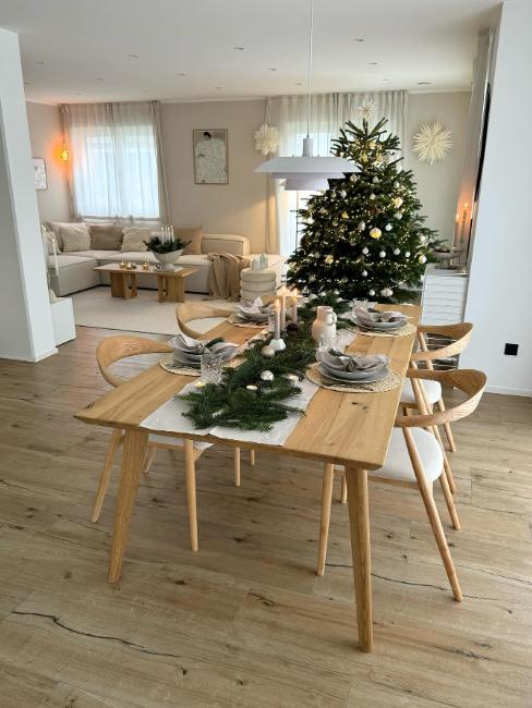 table de cuisine couverte de plats, gâteaux et avec un bouquet de fleurs fraîches, un tableau sur le mur, suspension moderne au dessus de la table à manger