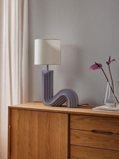 mur de couleur mauve dans un salon design blanc crème, notes jaune safran