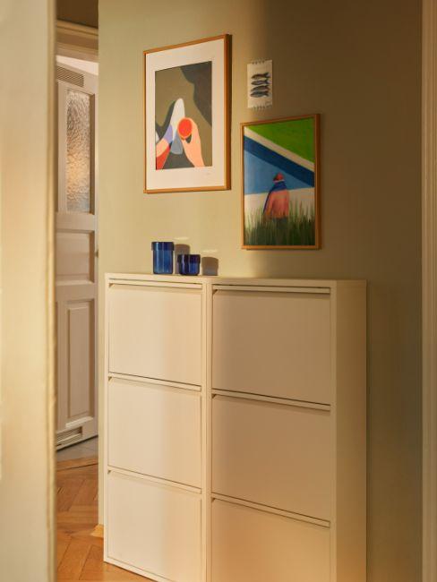 chambre moderne, lit gris, murs vert olive, tableau contemporain