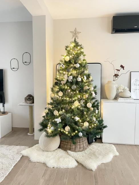 salon avec sol en parquet et mur blanc, tapis blanc, échelle en bois avec plaid, style épuré et scandinave