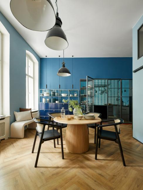 table dans salle à manger avec chaises en velours grises et assiettes noires westwing collection retro artsy