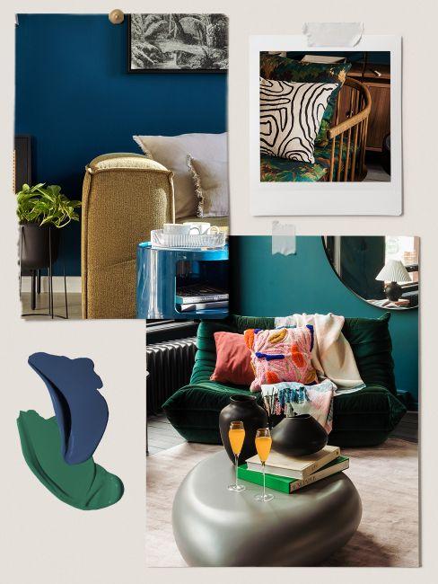 salon rétro, canapé crème, murs verts, coussin et plaid vert sapin