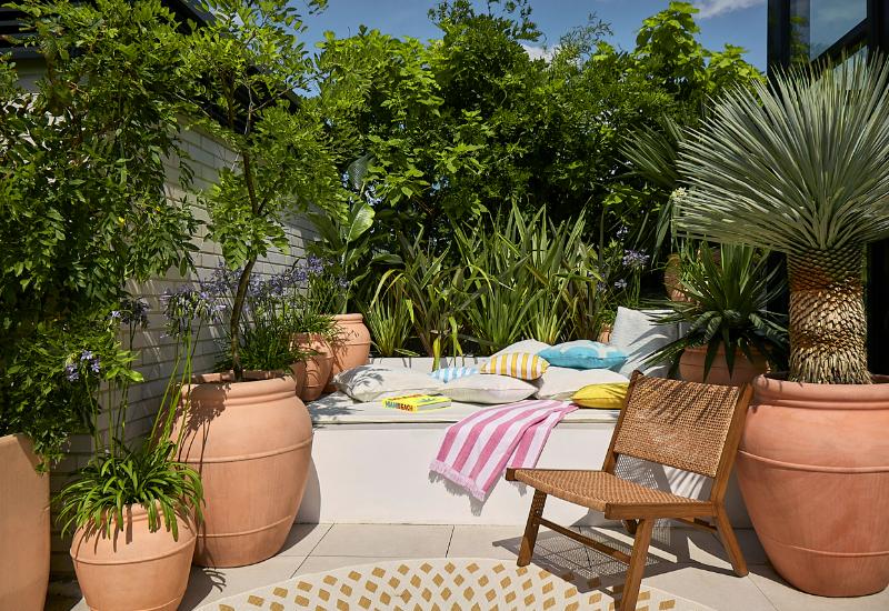 Plantes d'intérieur avec échelle en bois, tapis style peau de vache, pouf et coussins ethniques