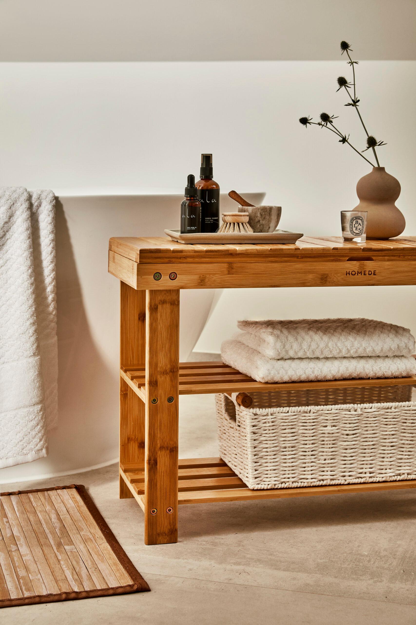 Salle de bain carrelée blanche avec carrelage mural noir et tabouret noir au premier plan