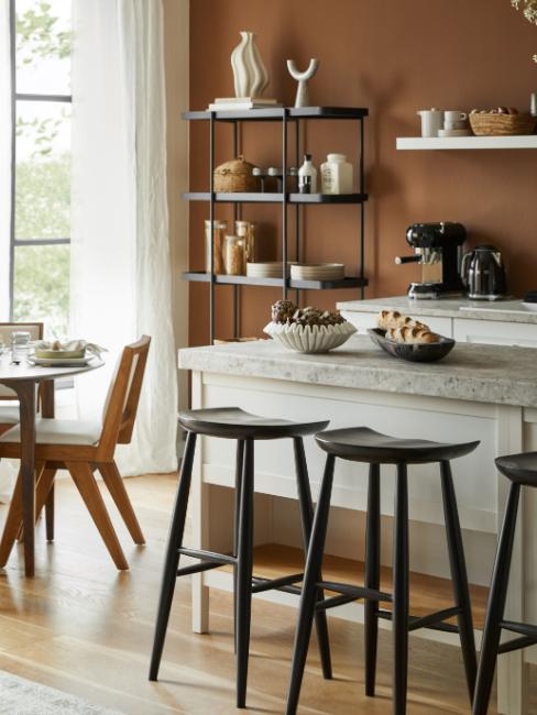 Si votre cuisine est aménagée en blanc et noir, vous pourrez peindre en cognac le mur de votre cuisinière. Un seul pan de mur suffira. Observez aussi que, comme ici, le blanc et le noir doivent équilibrés de manière à garder de la luminosité en ajoutant des touches de caractère.