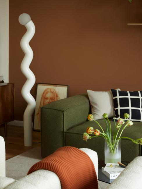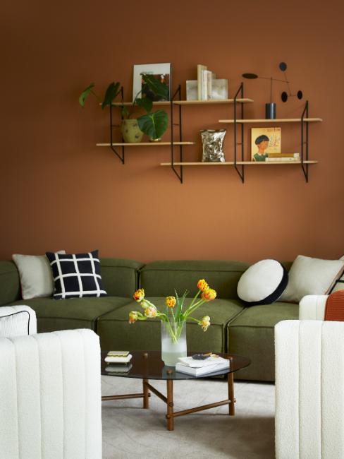 Si une peinture cognac vous tente pour votre salon, appliquez-la sur un seul pan de mur. Ce mur d’accent fera ressortir votre canapé et vos plus belles pièces de déco. Quant aux styles, adoptez cette couleur dans un salon aux meubles modernes, rétro et/ou design dans des couleurs claires, neutres, ou terreuses.