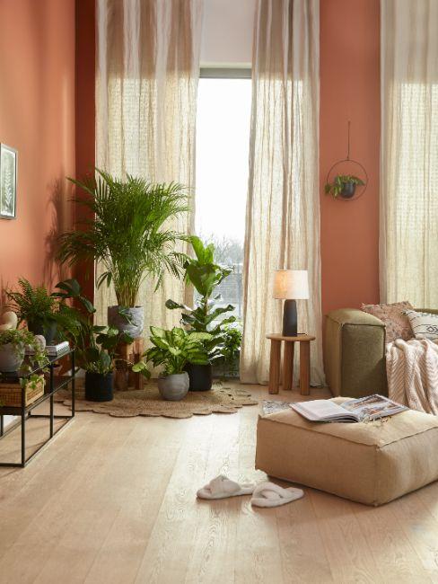 Plus fraîche la nuance terracotta peut mieux vous convenir si craignez de perdre en luminosité. Elle se marie bien avec de nombreuses plantes, du mobilier beige et des matériaux comme le bois clair et les fibres comme le jute et le rotin. Vous obtiendrez une ambiance douce et fraîche.