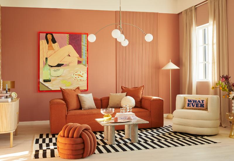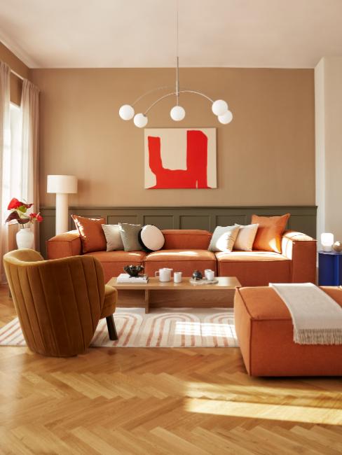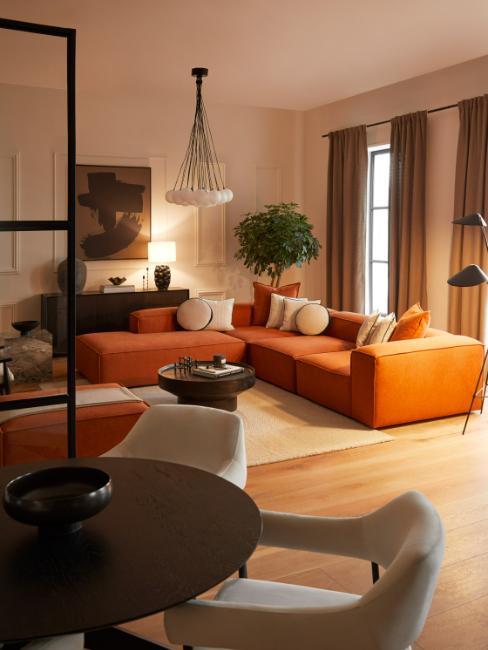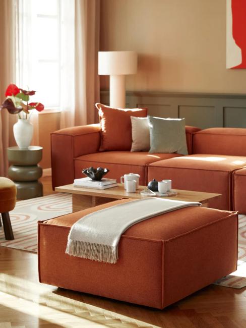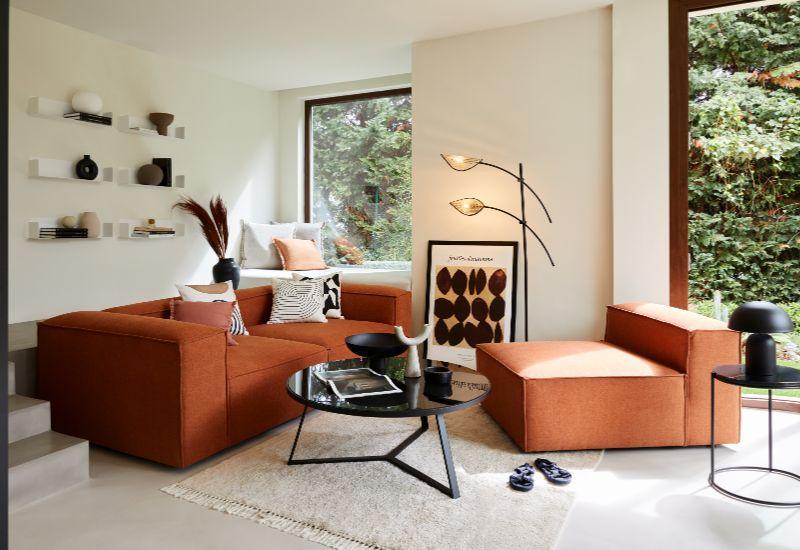 Un salon élégant avec un canapé terracotta comme pièce forte
