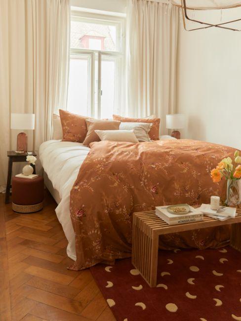 Dans votre chambre, les nuances de terracotta peuvent aussi être invitées par les textiles. Ici, un tapis terracotta foncé et du linge de lit plus clair rendent l’espace très accueillant. Remarquez aussi que les motifs dorés et beige posent des notes brillantes, de même que le blanc crème reste dominant pour préserver la luminosité.