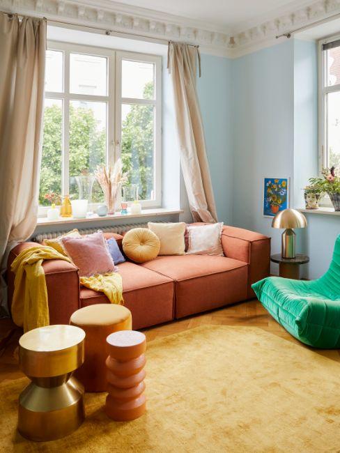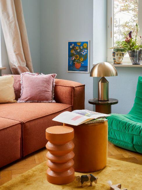 Un salon vintage avec une déco terracotta, orange et moutarde